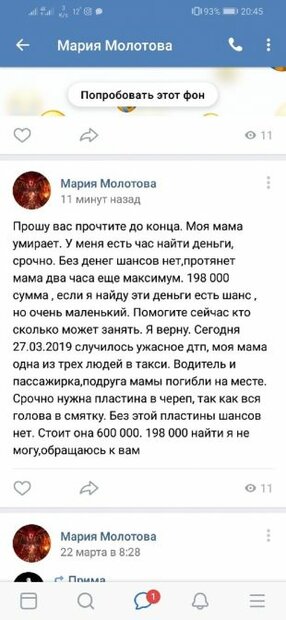 На странице знакомого в соцсети появляется пост о том, что у него случилось горе. Умирает близкий родственник, кто-то попал в аварию, кого-то арестовали. Срочно нужна помощь, переведите денег, вот номер карты. Иногда к посту прилагаются даже фото медицинских документов.