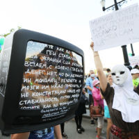 В эту субботу собралось много креативных личностей, поэтому и перфомансов хватало. Группа людей принесли телевизор, экран покрыт надписями и лозунгами "Нет права на выбор".
