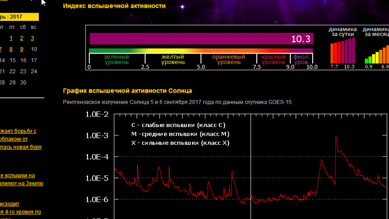 Динамика солнечной активности начала возрастать с 4 сентября. 6 сентября произошли две подряд вспышки класса Х, одна из них та самая, про которую все говорят, мощностью 9,3 балла.