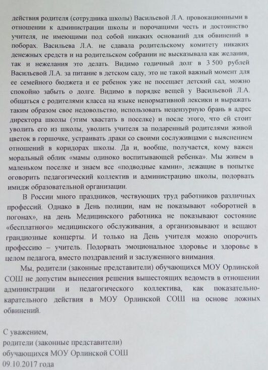 «Каждый мечтает о такой кормушке- рублей 600 в месяц. Правда, я на собачий корм больше в месяц трачу. Вся эта шумиха из ничего диверсия, чтобы испортить ученикам и учителям праздник юбилей школы. С праздником вас, дорогие коллеги!»