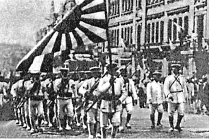 А во вторую половину дня в нашу школу пришли они - японцы… По нашей Большой улице шел японский батальон, ротными колоннами по 4 с развернутым батальонным флагом в голове колонны, под барабанную дробь и звуки горнов. Впереди, верхом на рыжей, английской крови, лошади, ехал командир.