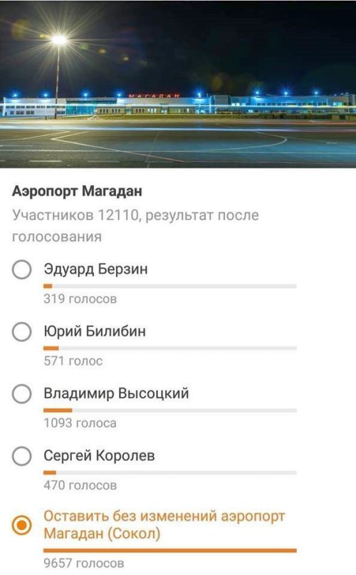 В Фейсбуке произведен опрос по поводу переименования аэропорта «Сокол». К этому обращению, я прилагаю результат опроса. Это не фальшь. Это люди, которые голосовали единожды, со своих личных аккаунтов. Там и мой голос и голоса моих друзей по «ФБ».