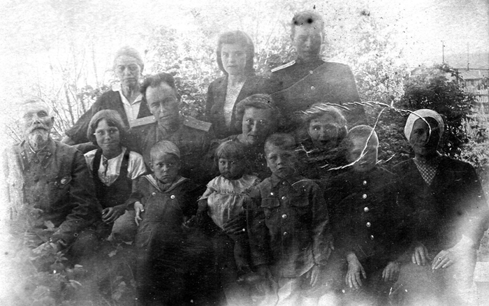 Семья Спригулей, лето 1945-го или 1946-го. Слева направо стоят: бабушка Аня, тетя Лёля, папа Миша; сидят: дед Яша (его не стало в 1947г), Нина, дядя Витя с Вовой, тетя Ася с маленькой Лёлей, мама Клава с Аликом и Витей, бабушка Ганя Симонова - мама "Асюни"