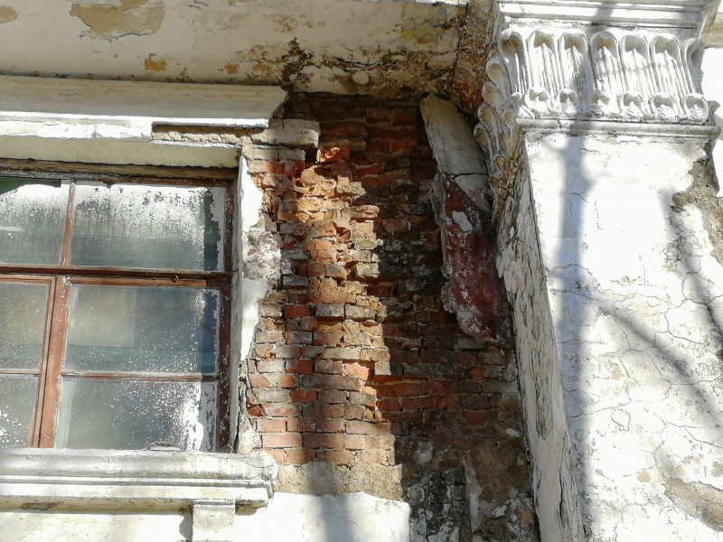 Я был в этом здании. Накануне похода Тарасова и Ворбьева и ролика, снятого ими внутри. Что они там искали — непонятно, ведь всё начинается уже снаружи. Фотографии вам пришлю, потому что внутри поста их прикрепить нет возможности. Впрочем, вы и сами можете с улицы Ленина лицезреть «надежную» кладку, осыпающуюся со второго этажа, а если зайдёте со стороны сквера, то — увидите и поехавшую кирпичную кладку, и горизонтальные трещины у основания здания. В них можно ладонь спокойно засунуть… Но мы же этого не видим, да? Или не хотим видеть? Надеюсь, вы всерьёз не воспринимаете попытки штукатуркой долбить кирпич, в качестве доказательства надежности стен здания?