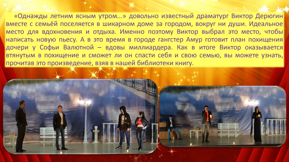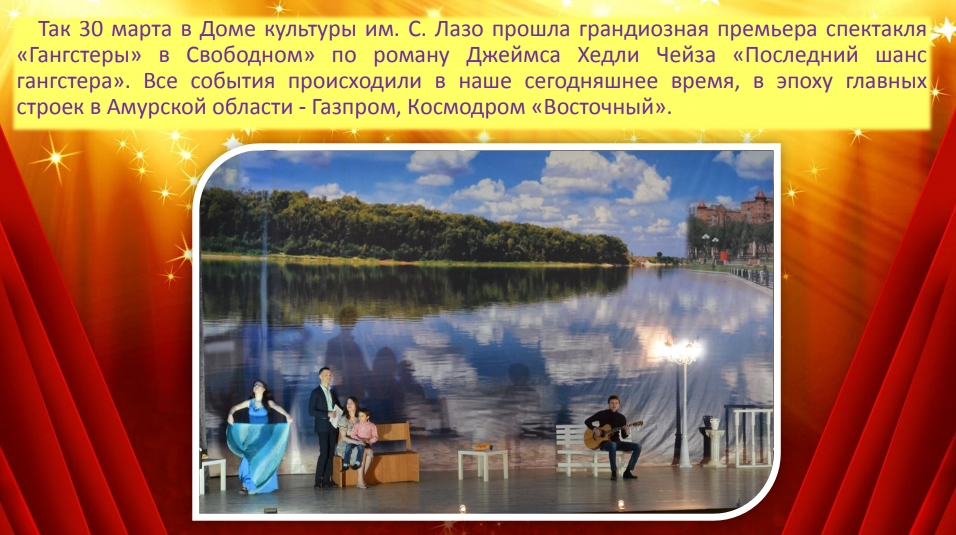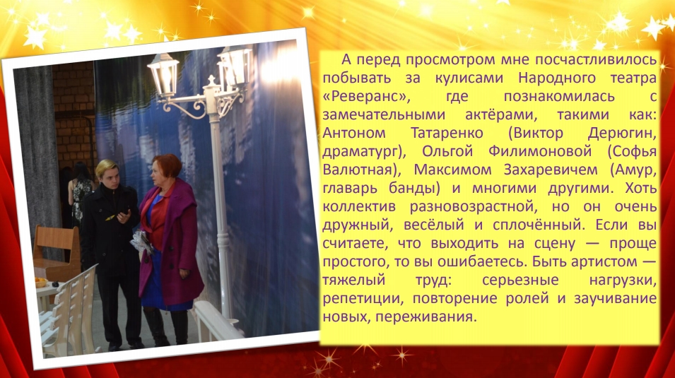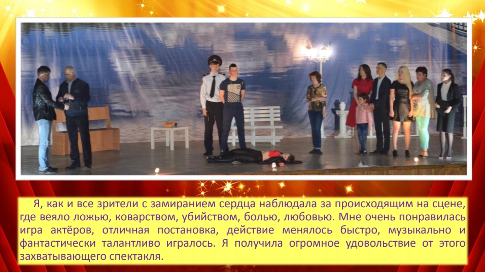 Отдельное спасибо режиссёру - Азаренко Валентине Георгиевне и всей труппе театра "Реверанс", в скором времени планирующих защиту статуса "НАРОДНЫЙ ТЕАТР".