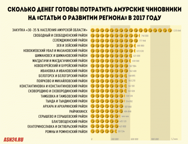Больше всего денег получат Свободненский и Селемджинский районы. Самым экономным станет Ромненский район. Отдельно 1,23 миллиона рублей выделены на распространение информации в газетах, которые читает треть жителей области.