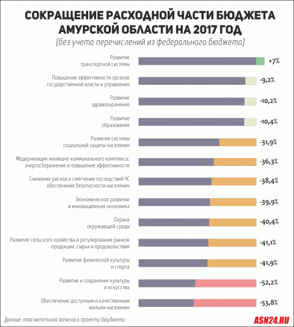 Стоит отметить, что амурские депутаты в конце 2016 года приняли очень непростой бюджет области на 2017 год. Как ранее сообщало АСН24, чтобы начать гасить госдолг, который копился в течение десяти лет, пришлось уменьшить расходную часть бюджета — траты на поддержку многих программ. К примеру, по результатам первого чтения бюджета, финасирование программы обеспечения амурчан доступным и качественным жильем урезали на 535 миллионов (-54 %). Программа экономического развития региона уменьшилась на 130,5 миллиона рублей.
