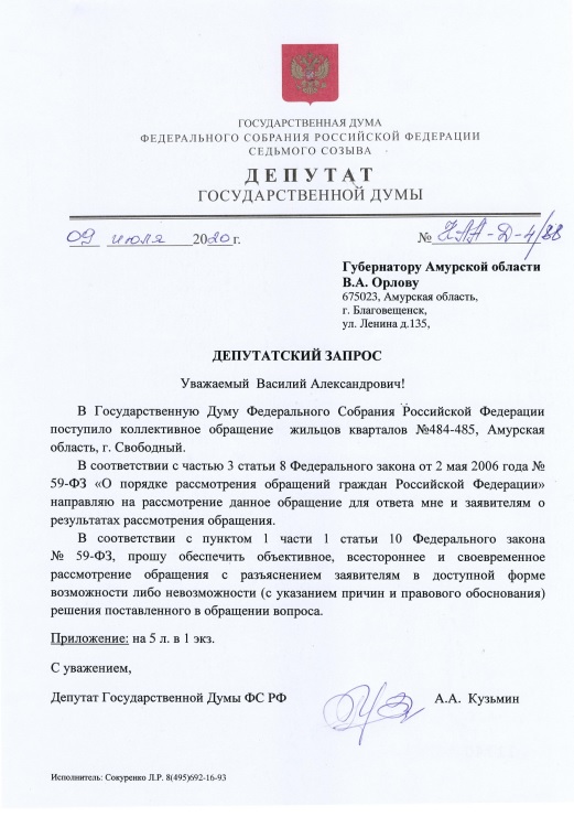 Оперативно отреагировал депутат Государственной Думы от Амурской области Кузьмин Андрей Альбертович, тут же направив депутатский запрос губернатору Амурской области Орлову Василию Александровичу: