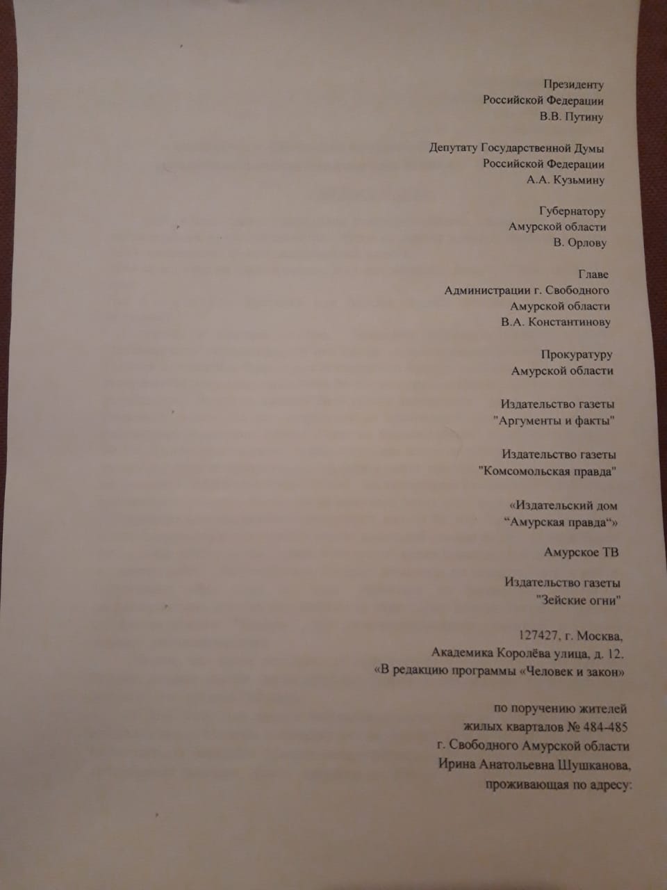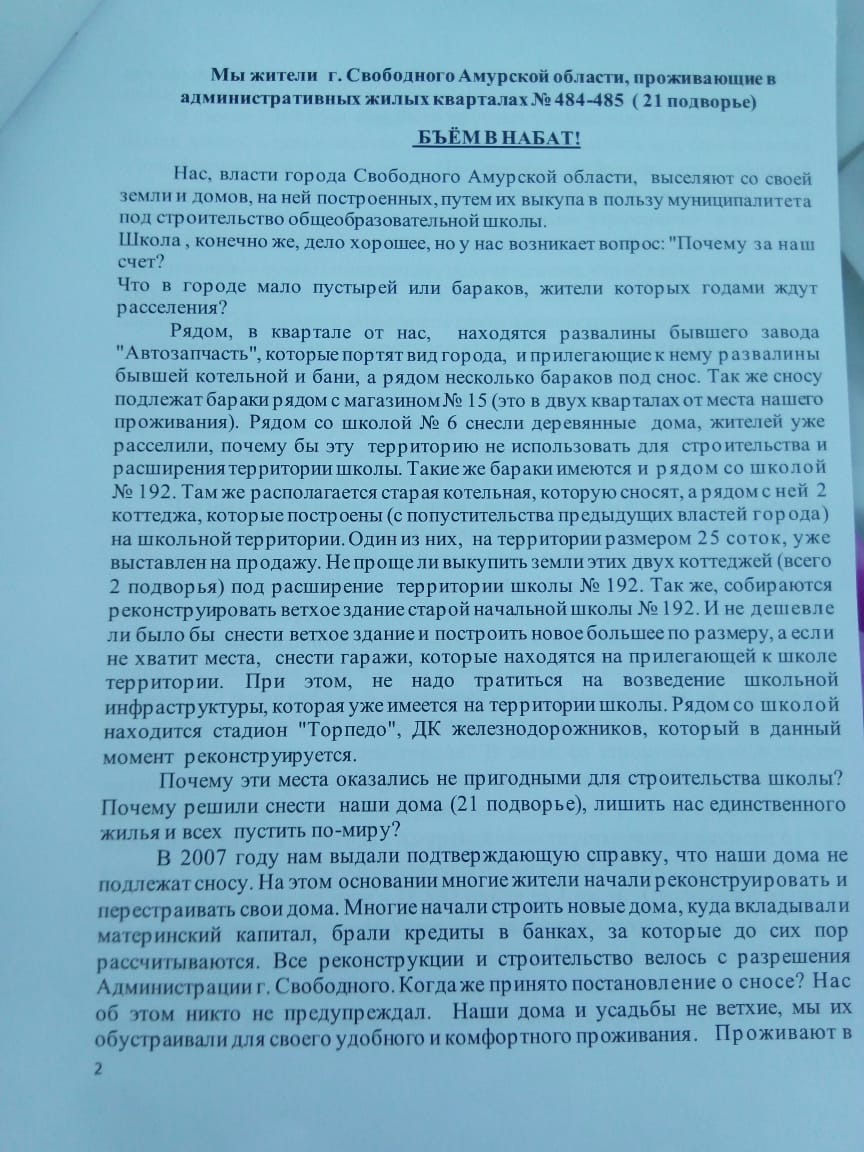 Мы, жители г. Свободного Амурской области, проживающие в административных жилых кварталах № 484-485 (21 подворье)