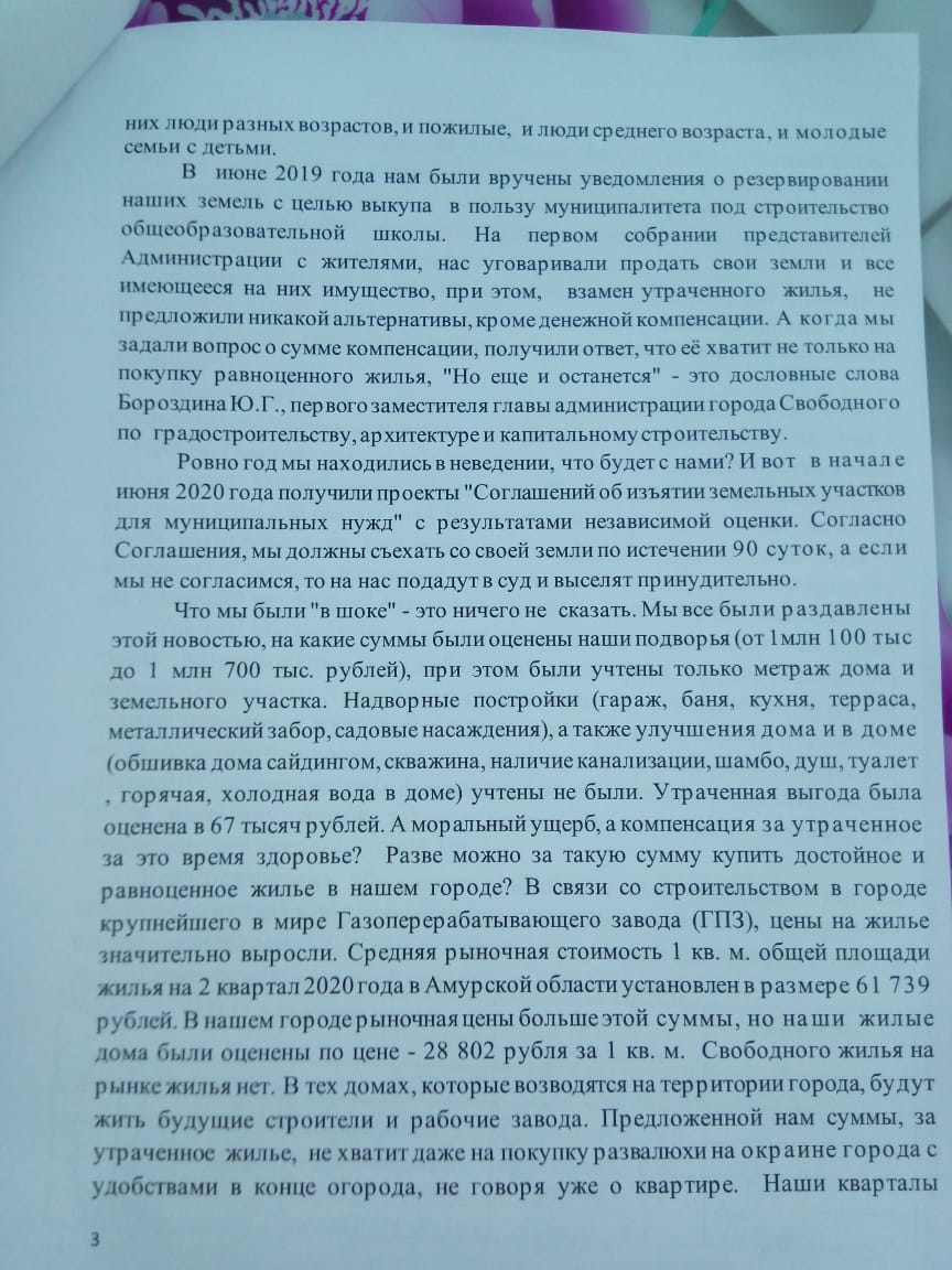 Что мы были "в шоке" - это ничего не сказать. Мы все были раздавлены этой новостью, на какие суммы были оценены наши подворья (от 1млн 100 тыс до 1 млн 700 тыс. рублей), при этом были учтены только метраж дома и земельного участка. Надворные постройки (гараж, баня, кухня, терраса, металлический забор, садовые насаждения), а также улучшения дома и в доме (обшивка дома сайдингом, скважина, наличие канализации, шамбо, душ, туалет , горячая, холодная вода в доме) учтены не были. Утраченная выгода была оценена в 67 тысяч рублей. А моральный ущерб, а компенсация за утраченное за это время здоровье? Разве можно за такую сумму купить достойное и равноценное жилье в нашем городе? В связи со строительством в городе крупнейшего в мире Газоперерабатывающего завода (ГПЗ), цены на жилье значительно выросли. Средняя рыночная стоимость 1 кв. м. общей площади жилья на 2 квартал 2020 года в Амурской области установлен в размере 61 739 рублей. В нашем городе рыночная цены больше этой суммы, но наши жилые дома были оценены по цене - 28 802 рубля за 1 кв. м. Свободного жилья на рынке жилья нет. В тех домах, которые возводятся на территории города, будут жить будущие строители и рабочие завода. Предложенной нам суммы, за утраченное жилье, не хватит даже на покупку развалюхи на окраине города с удобствами в конце огорода, не говоря уже о квартире. Наши кварталы находятся в спальном районе города, где в шаговой доступности: поликлиника, 2 школы, детские сады, аптеки, магазины, автобусные остановки. При оценке нашего имущества были взяты цены на дома не в нашем районе, а находящиеся на окраинах города. Получается, что мы не только не улучшим свои жилищные условия, как нам обещали, а совсем его потеряем.