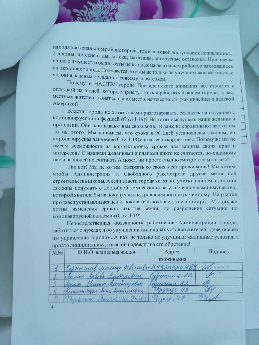 Мы хотим, чтобы Администрация г. Свободного рассмотрела другие места под строительства школы. А если власти города хотят получить наши земли, то они должны подумать о достойной компенсации за утраченное нами имущество, которой хватило бы на покупку жилья, равноценного утраченному. На рынке продавец устанавливает цены, покупатель покупает, а не наоборот. Мы так же хотим изменения сроков изъятия земли, до разрешения ситуации по коронавирусной пандемии (Covid-19).