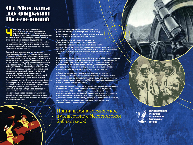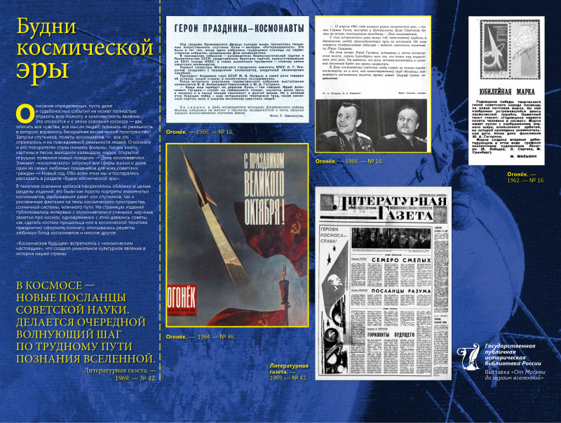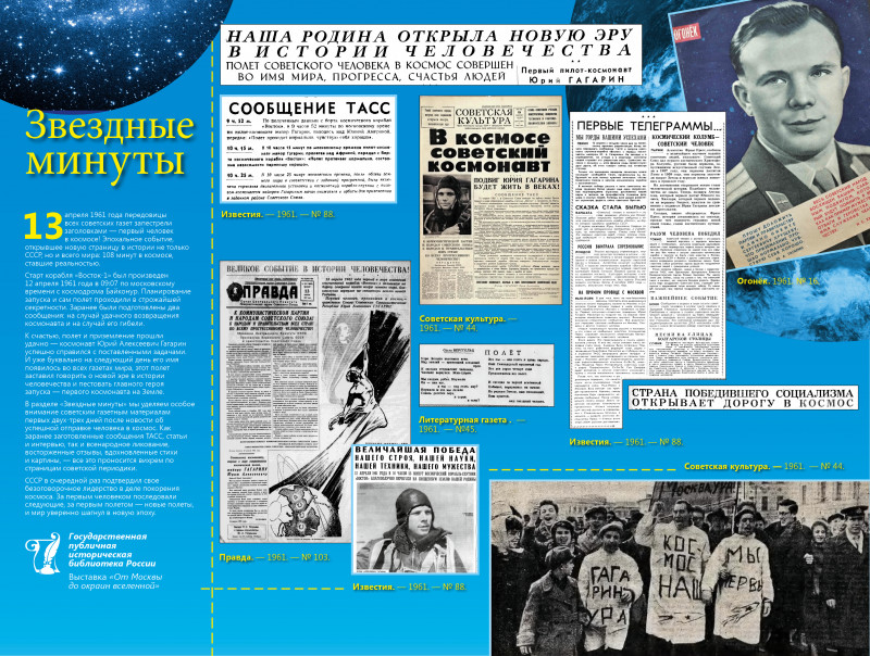 Выставка Государственной публичной исторической библиотеки России, посвященная 60-летию полета Ю.А. Гагарина в космос, покажет, как популярные СМИ рассказывали о ключевых событиях в истории освоения космического пространства.