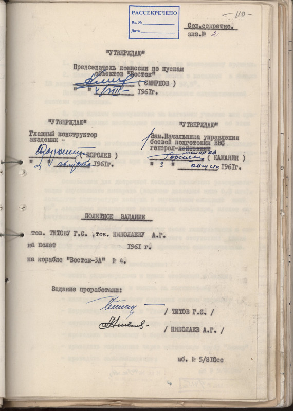 На основании этого 21 июля 1961 года начальник Центра подготовки космонавтов Е.А. Карпов составил доклад, в котором рекомендовал назначить космонавтов для второго космического полета в следующей очередности: Г.С. Титов, А.Г. Николаев и В.Ф. Быковский. В итоге Госкомиссия назначила основным пилотом «Востока-2» Г.С. Титова (позывной — «Орёл»), а дублером — А.Г. Николаева.