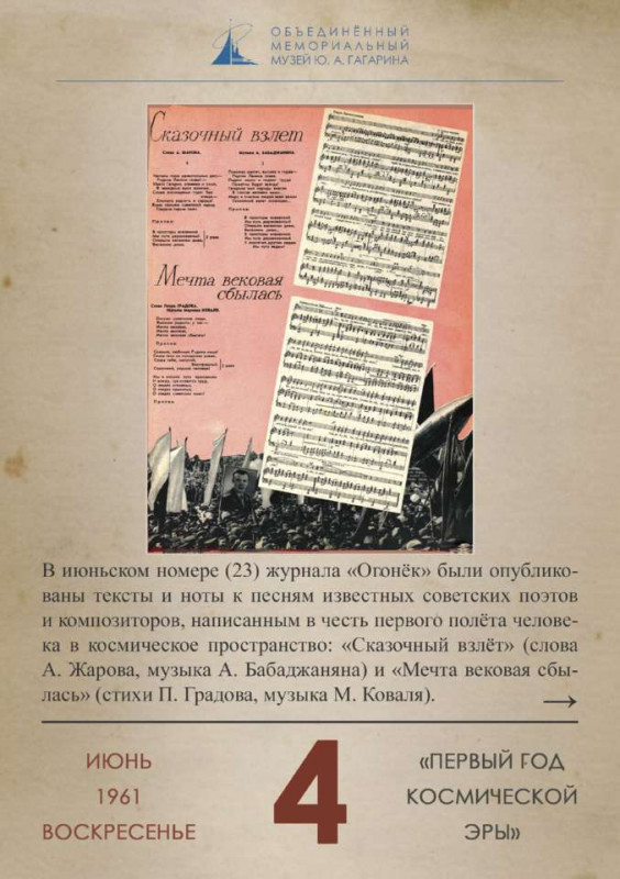 Учреждение Дня космонавтики (12 апреля) — можно считать отсчетом «Будней космической эры» — так называется пятый раздел выставки. Тема космоса становится одной из центральных в периодической печати, появляются целые разделы в газетах и журналах, связанные с космонавтикой и романтикой покорения межзвездных пространств.