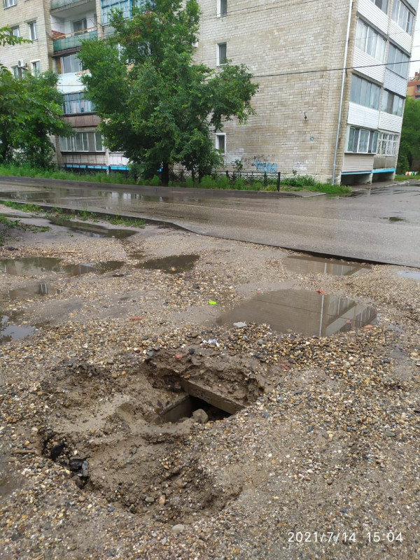 На днях фура при разгрузке буксовала и получилась такая яма (на фото), которую в придачу подмыл и недавний ливень... И вот результат - провалилась машина, которую доставали буксиром. Наверняка в сумерках здесь преспокойно может провалиться и человек…