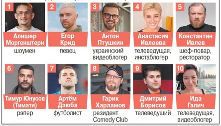 Исследовательский центр «Ромир» составил рейтинг персон, которые являются авторитетами для российской молодёжи 14–21 года, живущих в городах с населением свыше 100 тыс. человек. Результаты оказались и ожидаемыми, и неожиданными одновременно: в топ-10 не попал ни один писатель, актёр, режиссёр, классический музыкант.