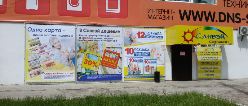 Фасадное баннерное панно (широкоформатная печать, постпечатная обработка, монтаж).