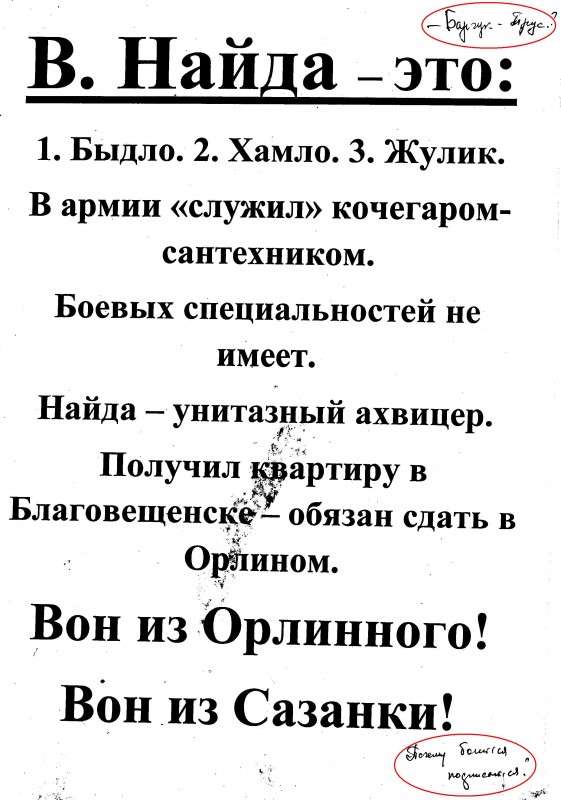 То, что в районной Администрации пришли к мнению, что автором сего, по мнению районной Администрации, пасквиля, являюсь я, говорит о том, что Найда В. В., вольно или невольно, но промолчал об хорошо известных ему принципах депутата Барчука, которые позволили бы усомнится в самой возможности такого поступка с моей стороны. Вместе с тем, я вполне понимаю психологическое состояние и основания для негодования истинного автора данной листовки, кем бы он ни был…