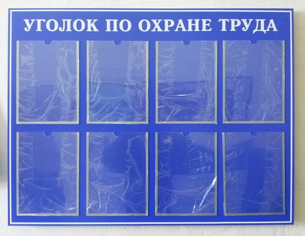 Размер стенда - 100 см * 80 см. Материал - пластик ПВХ 3 мм. Торцы стенда - 3 см. Фоновое покрытие - плёнка ORACAL, надпись (заголовок) - аппликация из плёнки ORACAL. "Карманы" плоские прозрачные для листов формата А4 (ПЭТ 0,5 мм) - 8 шт.