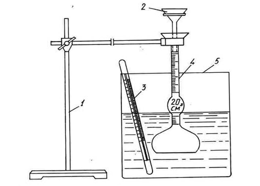 Прибор Ле-Шателье, закрепленный в штативе, помещают в стеклянный сосуд с водой так, чтобы вся его градуированная часть была погружена в воду. Необходимо, чтобы при отсчетах уровня жидкости в приборе температура воды в сосуде соответствовала температуре, при которой производили градуировку прибора.