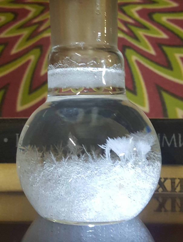 Согласно литературным источникам, прибор реагирует на изменение погоды. Эти данные весьма противоречивы, но типичное описание примерно таково: в период установления ясной погоды жидкость в колбе прозрачна, на дне имеется белый рыхлый осадок с четкой линией раздела; за несколько суток до наступления ненастья (значительные изменения скорости ветра, барометрического давления; выпадения осадков) в растворе появляются кристаллы причудливой формы. Иногда они заполняют весь объём колбы. При установлении ясной погоды кристаллы исчезают.