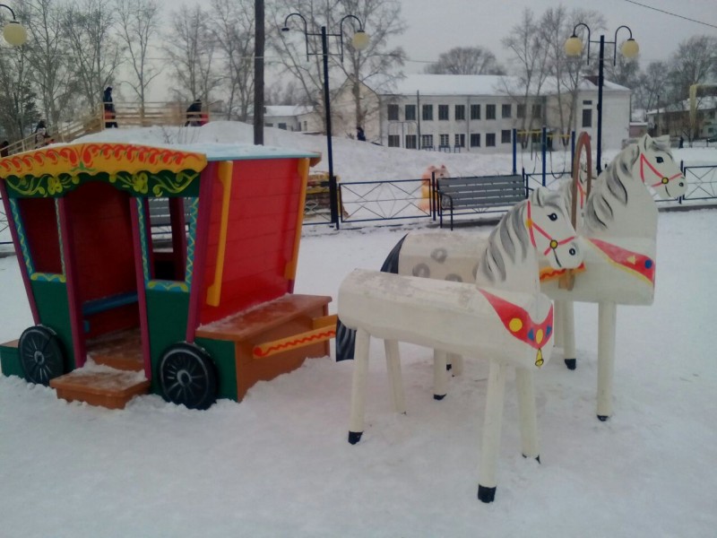 Карета, запряжённая тройкой деревянных лошадок