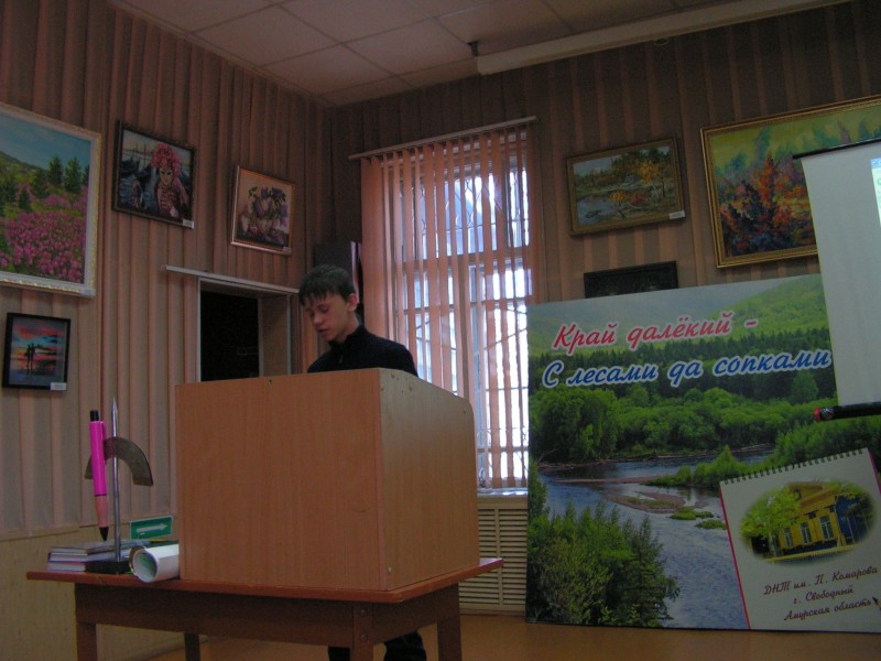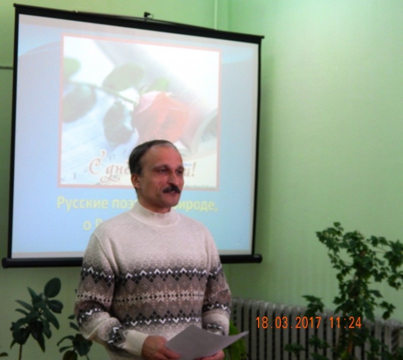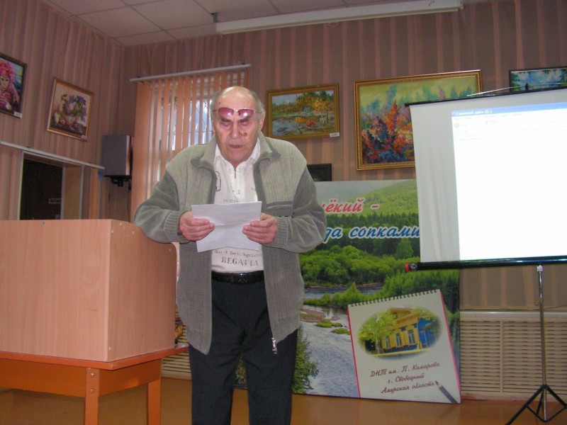 3. 18 марта в центральной городской библиотеке им. Н.К.Крупской состоялось мероприятие, посвящённое всемирному дню поэзии. Свободненское литературное объединение представляли на нём Вера Александровна Овчар, О.А.Похалюк, Ю.А.Тарасов, Вера Фёдоровна Фролова и С.Ю.Ярославцев.